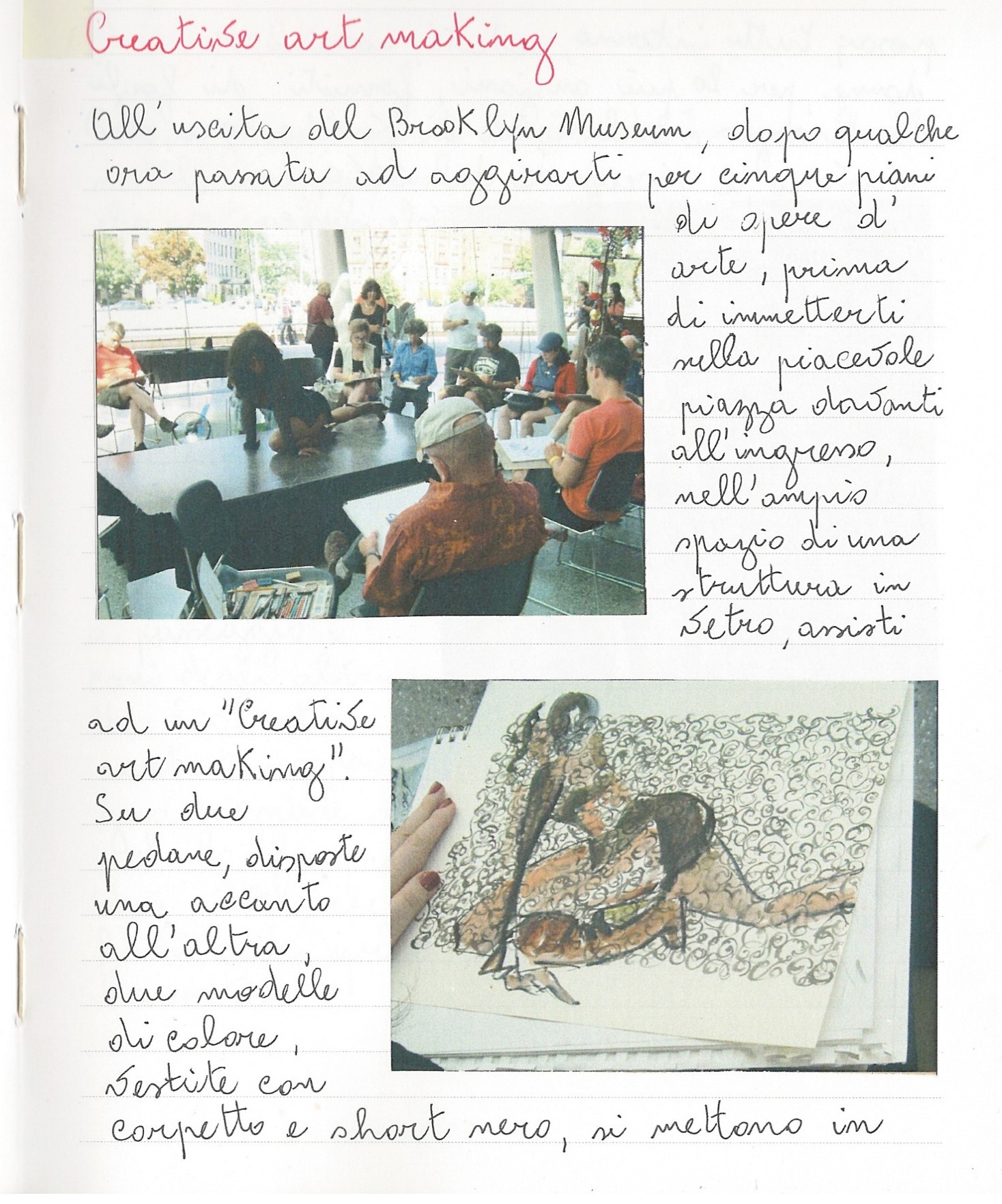 All’uscita del Brooklyn Museum, dopo tre ore passate ad aggirarti per cinque piani di opere d’arte, prima di immetterti nella piacevole piazza davanti all’ingresso, nell’ampio spazio di una struttura in vetro allestita nell’ atrio, assisti a un Creative Art making. Su due pedane, disposte una accanto all’altra, due modelle di colore, vestite con corpetto e short nero, si mettono in posa; tutti intorno, seduti, uomini e donne, per lo più maturi, forniti di fi fogli da disegno e carboncini di vari colori, che provano a disegnare dal vivo con il sottofondo di una gradevole musica.