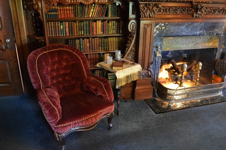 il soggiorno con un ampio camino, sopra il quale sono disegnati a destra un gatto e a sinistra una elegante dama con veste e cappellino azzurro: qui Twain intratteneva dopo la cena i suoi quattro figli, tre femmine e un maschio, con racconti che inevitabilmente cominciavano con un gatto e terminavano con l’apparizione della donna. Quasi una storia illustrata con le immagini, messe in azione dall’immaginazione del narratore e degli ascoltatori;