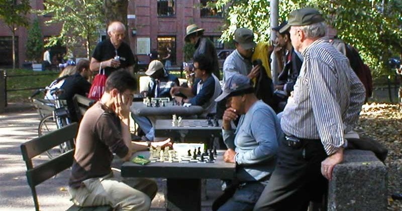 FOTO 2010 A Thompson Street, a poca distanza uno dall’altro, due “Chess Forum”, locali in cui si vendono esclusivamente scacchiere di ogni forma e materiale e dove, all’interno o all’ esterno, su tavolini con due sedie poste sul marciapiede, puoi giocare a scacchi, senza farti distrare dal capannello di persone che stanno a guardare le mosse degli sfidanti sulla scacchiera. Mi soffermo anche io e mi accorgo subito che si tratta di giocatori esperti. E non penso proprio di ripetere l’esperienza al Juniper con Nicolau.