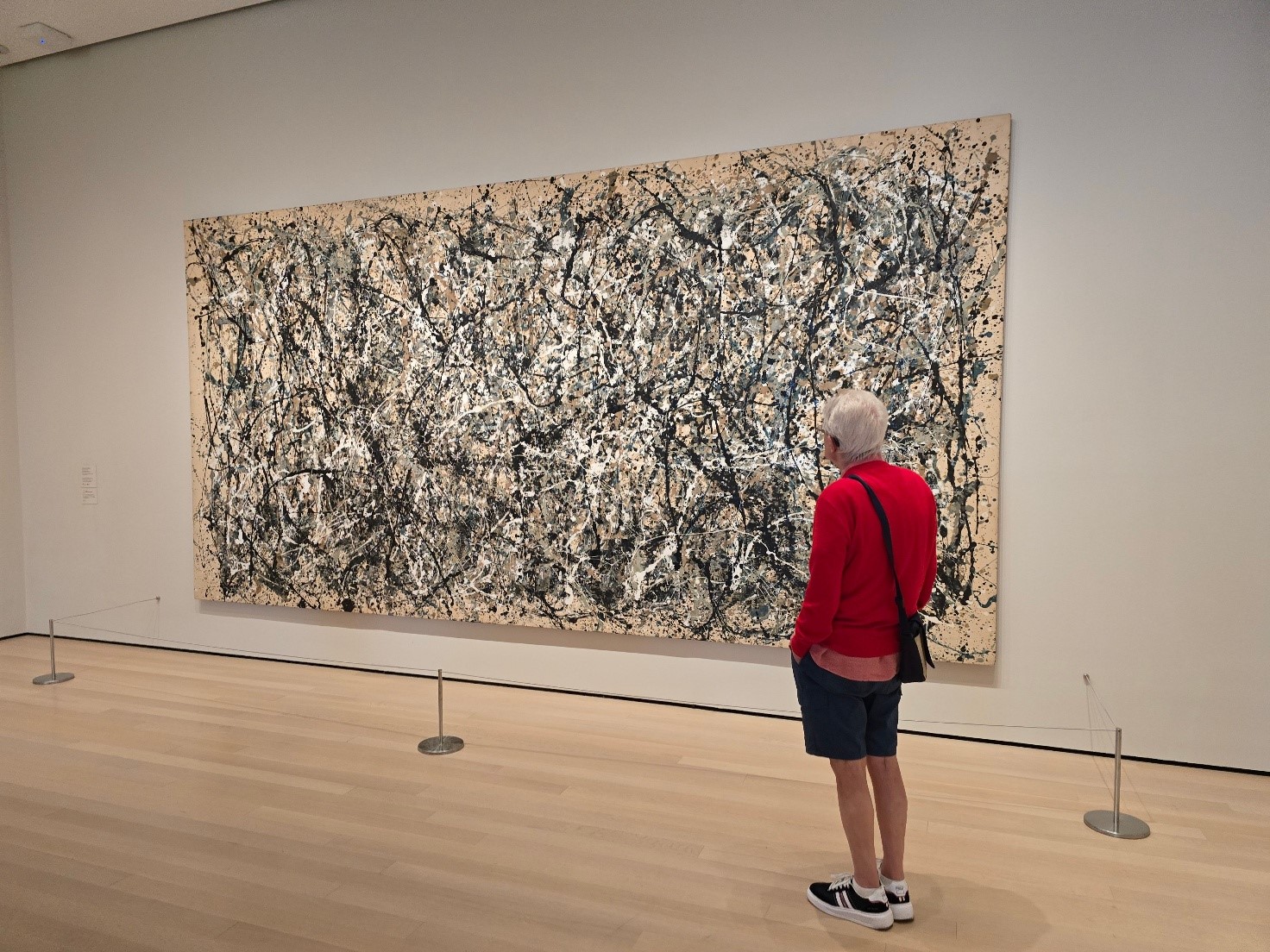 Siedo su una panca e me ne sto per un po’ a contemplare One number 5 (1950)., che per le sue dimensioni, 5,30 x 2,70. Occupa interamente una parete di una sala. È di Jackson Pollock, l’artista che nel dipingere utilizzava la tecnica del dripping: stendeva la tela sul pavimento e si muoveva liberamente intorno ad essa, facendo gocciolare il pennello carico di colore, a formare grovigli in cui riusciva a imprigionare tutto ciò che nella realtà si trovava in continuo movimento.