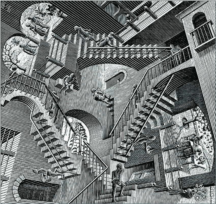 Relatività (1953), una delle opere più iconiche di M.C. Escher, è particolarmente celebre per la sua rappresentazione di scale impossibili che si intrecciano in modi apparentemente irrazionali, sfidando le leggi della prospettiva e la coerenza spaziale.