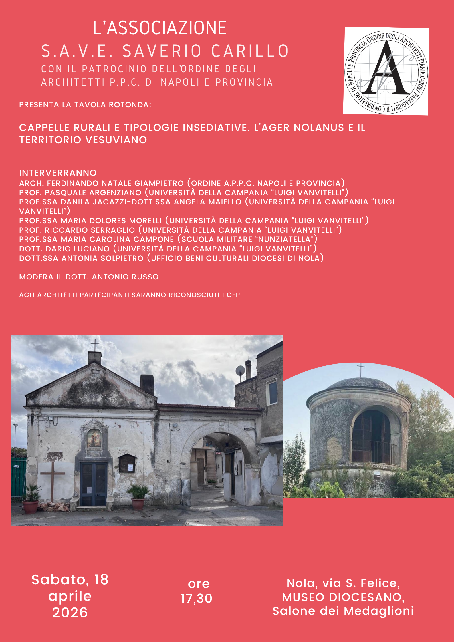 L’evento è promosso dall’Associazione “S.A.V.E. Saverio Carillo” con il patrocinio morale dell’Ordine degli Architetti P.P.C. di Napoli e provincia ed è utile al conseguimento dei crediti professionali per gli iscritti all’Ordine.
