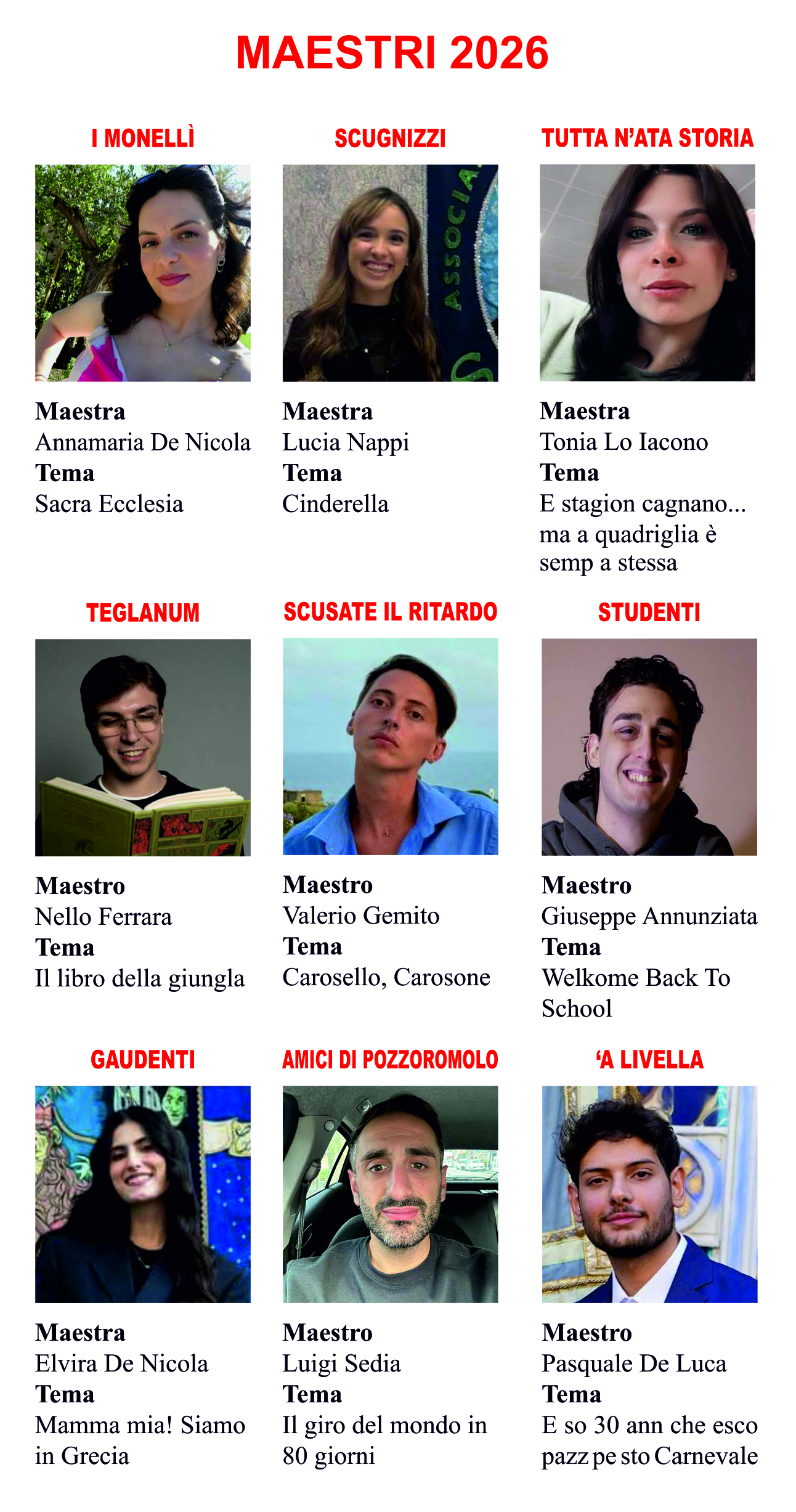 Il libro della giungla è l’argomento scelto dalla Teglanum, con il maestro Nello Ferrara, fino ad arrivare agli Studenti, pronti a proporre un simpatico ritorno a scuola con il maestro Giuseppe Annunziata, e a Tutta n’Ata Storia, che con la maestra Tonia Lo Iacono parlerà delle stagioni che cambiano, anche se la Quadriglia rimane sempre la stessa, unica e inconfondibile protagonista del magico Carnevale di Palma.