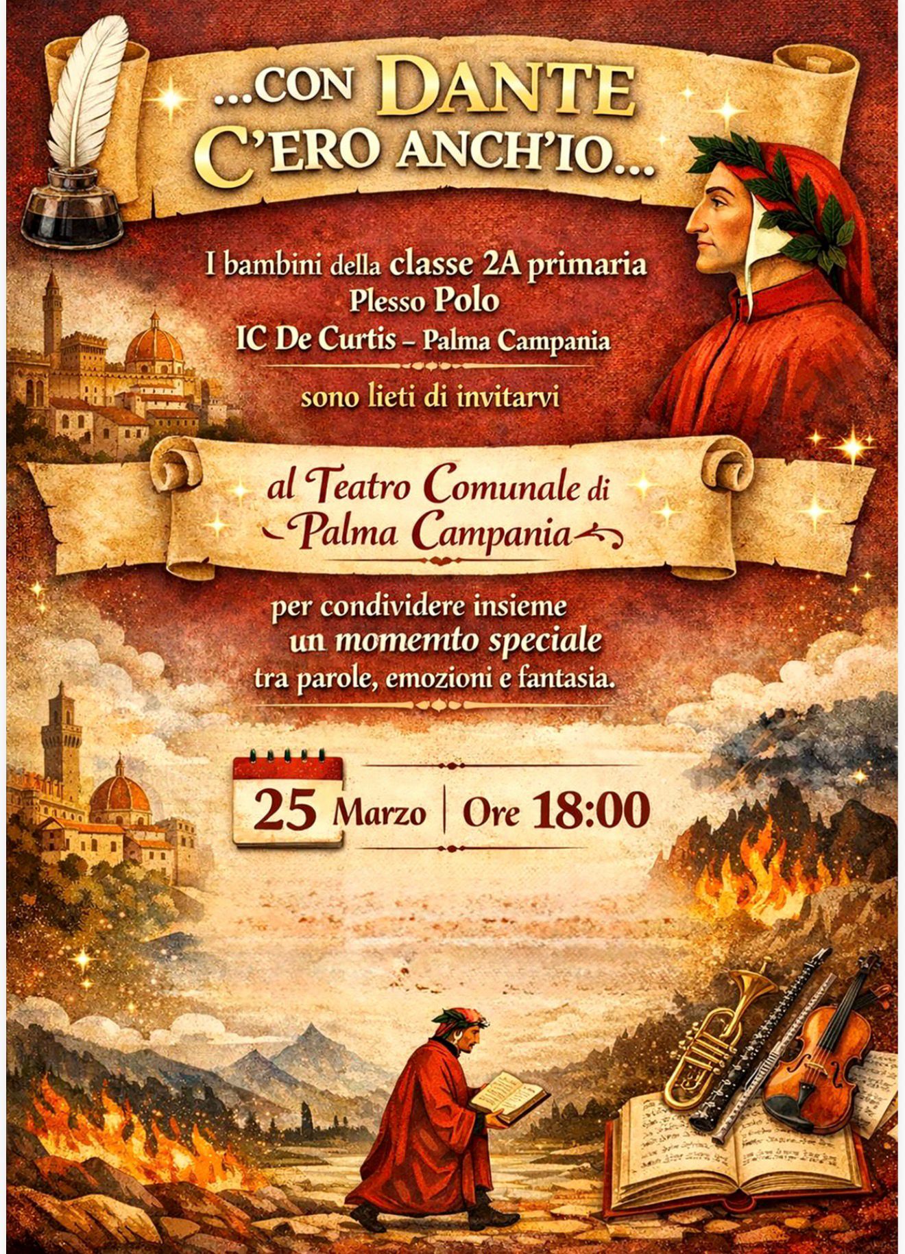 La classe 2A Primaria – plesso Polo – dell’Istituto Comprensivo “Antonio De Curtis” di Palma Campania sarà protagonista questa sera di un evento che si terrà al teatro comunale, dalle ore 18:00, dal titolo Con Dante c’ero anch’io.