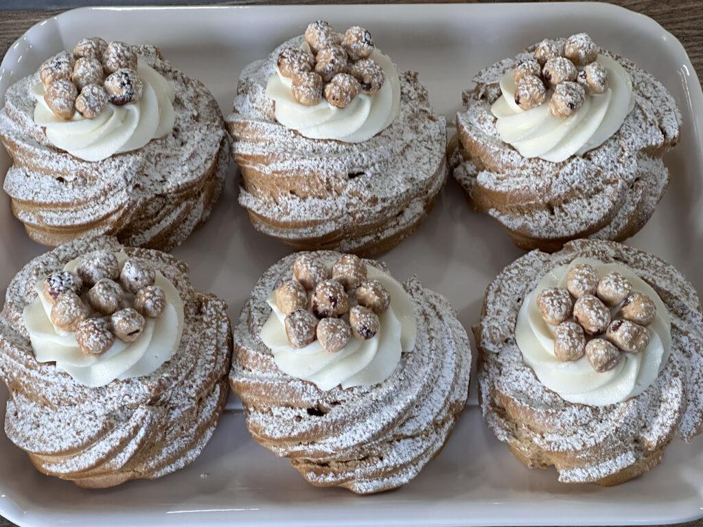 Non è un caso che in spagnolo “nocciola” si dica ‘avellana’ e in portoghese ‘avelã’: Avella ha dato il nome alla nocciola in mezzo mondo, e non è un caso che la pianta, il nocciòlo comune, sia Corylus avellana. La nocciola avellana nella storia è un must mondiale, infatti quando alla fine dell’Ottocento Joseph Manner inventò i celebri wafer a Vienna, il gusto alla nocciola venne battezzato ‘Neapolitaner’ proprio perché la nocciola prodotta tra i comuni di Napoli e avellinesi, quella di Avella, era considerata la migliore d’Europa. La Zeppola Avellana nasce per celebrare tutto questo: impasto arricchito con pasta di nocciole, crema di ricotta di pecora, spolverata di zucchero a velo e nocciole intere a guarnizione.