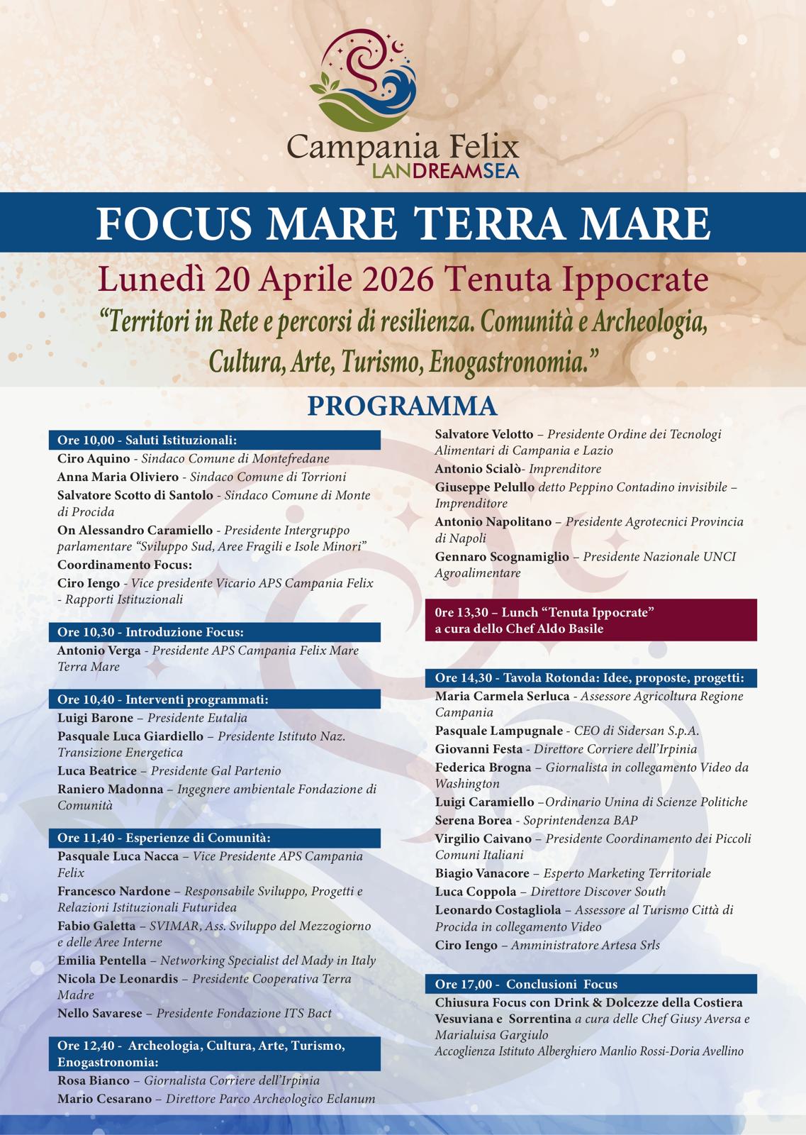 Il coordinamento del Focus sé affidato a Ciro Iengo, Vice presidente e delegato ai Rapporti istituzionali di Campania Felix APS. Il Focus si articola in sei Panel, nei quali personalità di spicco del panorama nazionale, esperti, imprenditori, giornalisti e rappresentanti istituzionali si confronteranno sulle tematiche della resilienza dei territori e sui percorsi di sviluppo, cultura, turismo ed enogastronomia, che rappresentano i pilastri portanti dell’economia dei territori costieri e delle aree interne.