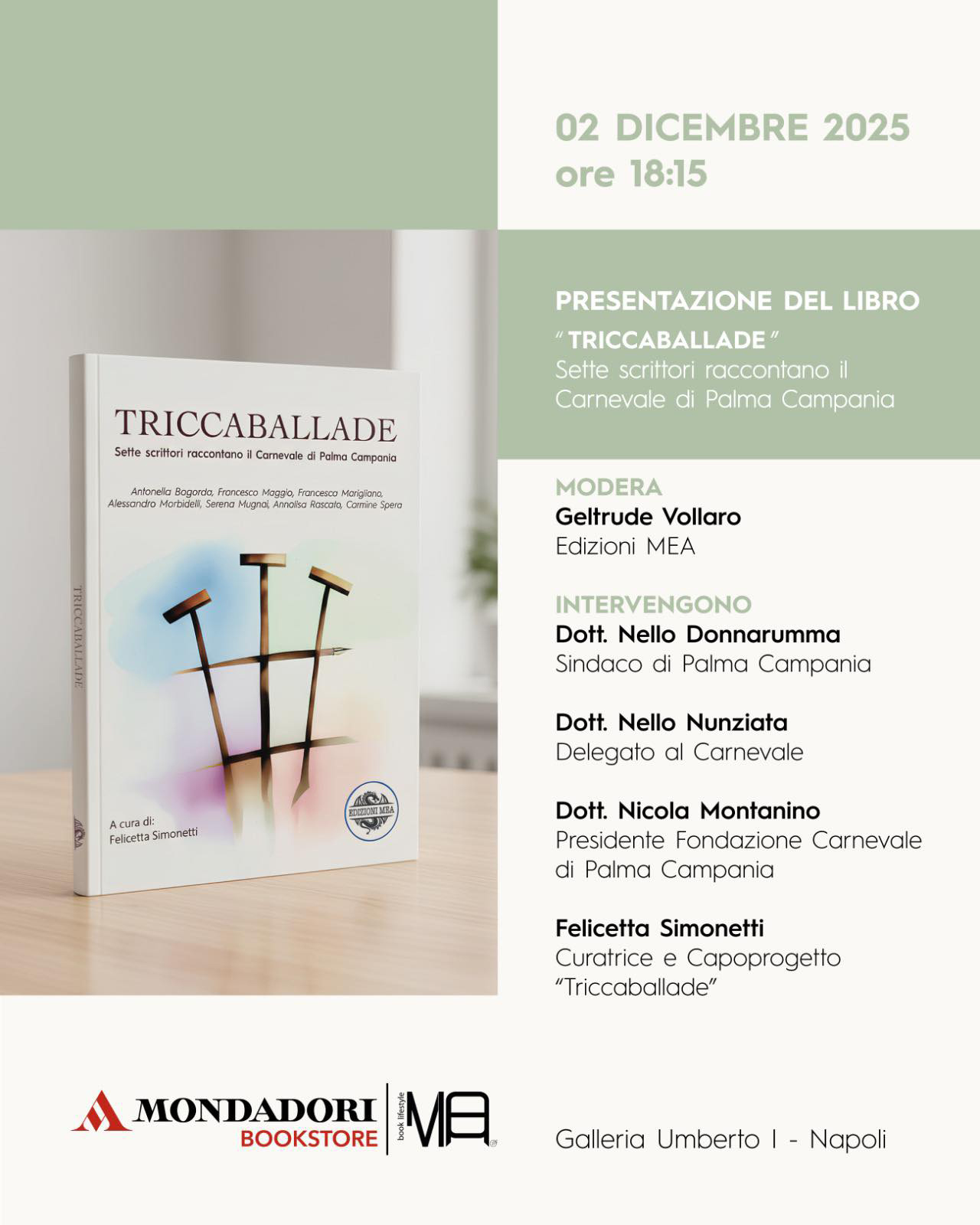 Palma Campania, 2025 – Esce per Edizioni MEA Triccaballade, la prima opera letteraria interamente dedicata all’esperienza immersiva del Carnevale di Palma Campania e alla sua macchina scenica più celebre: le Quadriglie. Un progetto unico, nato da un’idea del Sindaco Aniello Donnarumma, curato da Felicetta Simonetti, capoprogetto, in collaborazione con il Comune di Palma Campania e la Fondazione Carnevale, e realizzato con il contributo della L.R. Campania 13/2013 a sostegno dell’editoria regionale.