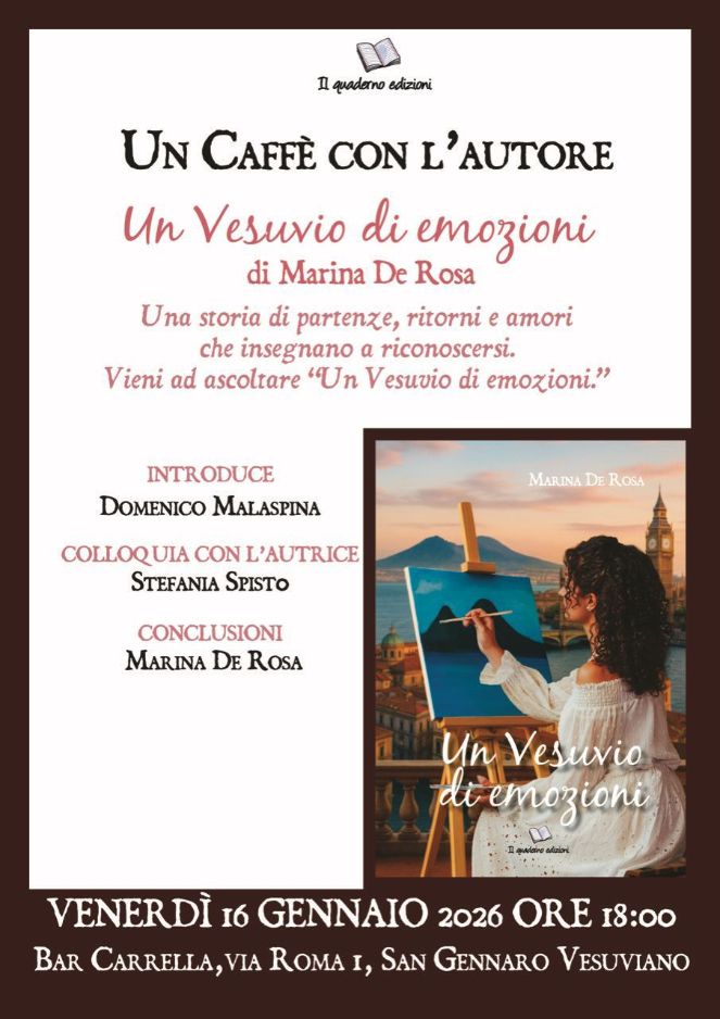 Nella giornata di venerdì 16 gennaio, nei locali del Bar Carrella di via Roma, a San Gennaro Vesuviano, si terrà la presentazione del libro Un Vesuvio di emozioni (per le stampe de Il Quaderno Edizioni) di Marina De Rosa.