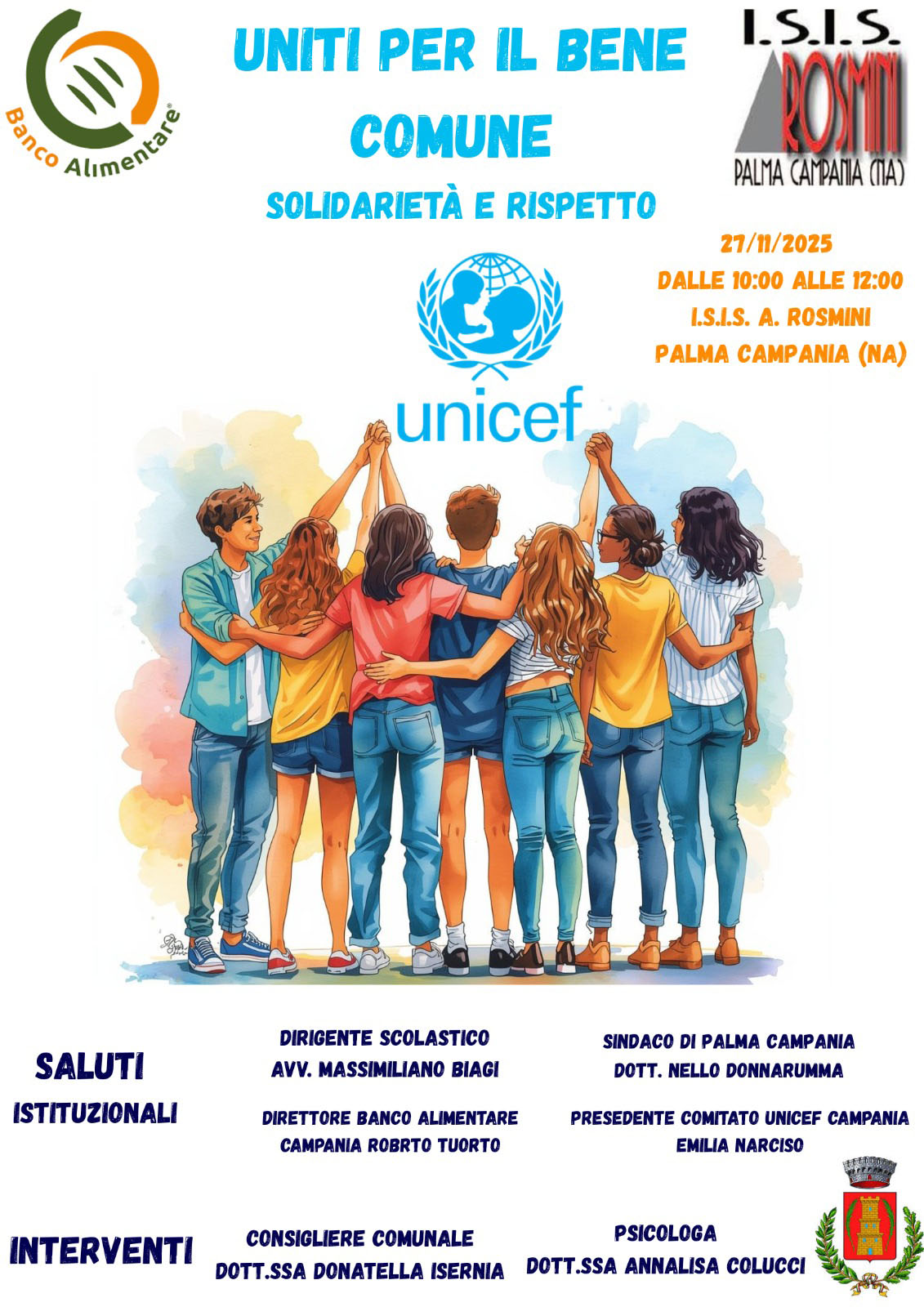 Un Bene Comune che unisce, nel segno della solidarietà e del rispetto. L’Isis “Rosmini” di Palma Campania promuove – in sinergia con il Comitato Unicef Campania, il Banco Alimentare Campania e il consigliere comunale Donatella Isernia, delegata alla Pubblica Istruzione – un incontro tematico nella giornata di venerdì 27 novembre 2025.