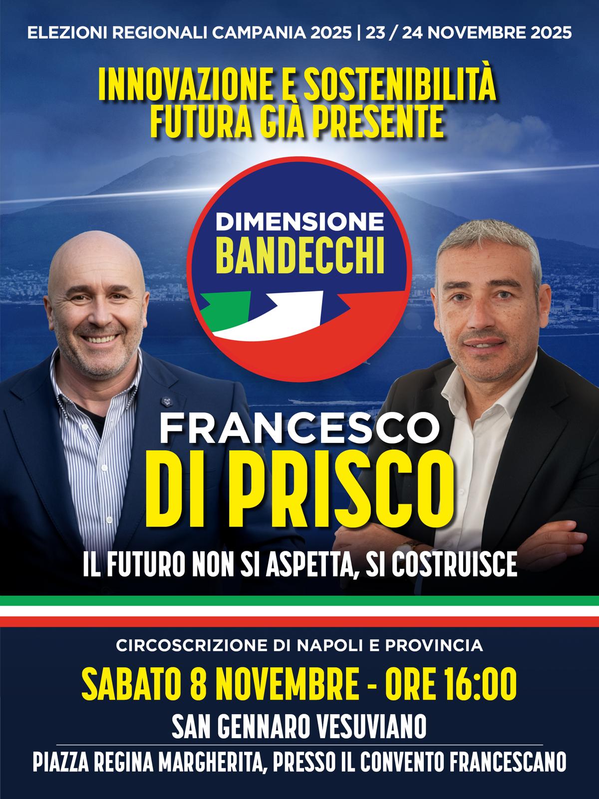 Geometra, 47 anni, titolare di uno studio tecnico e un interesse marcato per le nuove tecnologie. È questo il profilo di Francesco Di Prisco, sangennarese candidato con la lista “Dimensione Bandecchi” alle prossime elezioni Regionali in Campania, che si terranno nelle giornate del 23 e del 24 novembre 2025.
